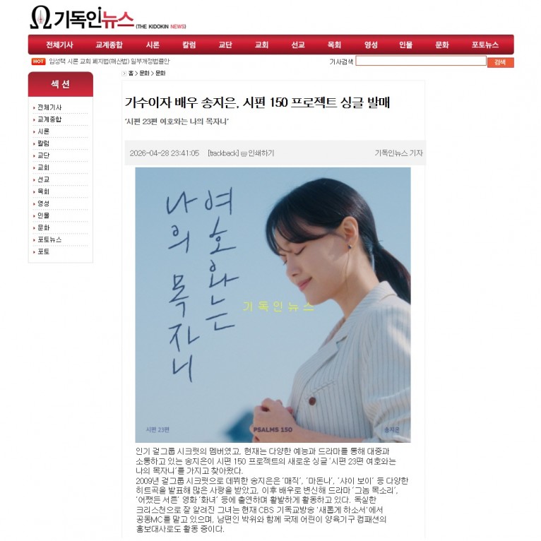 [기사] 가수이자 배우 송지은, 시편 150 프로젝트 싱글 발매(기독인뉴스)